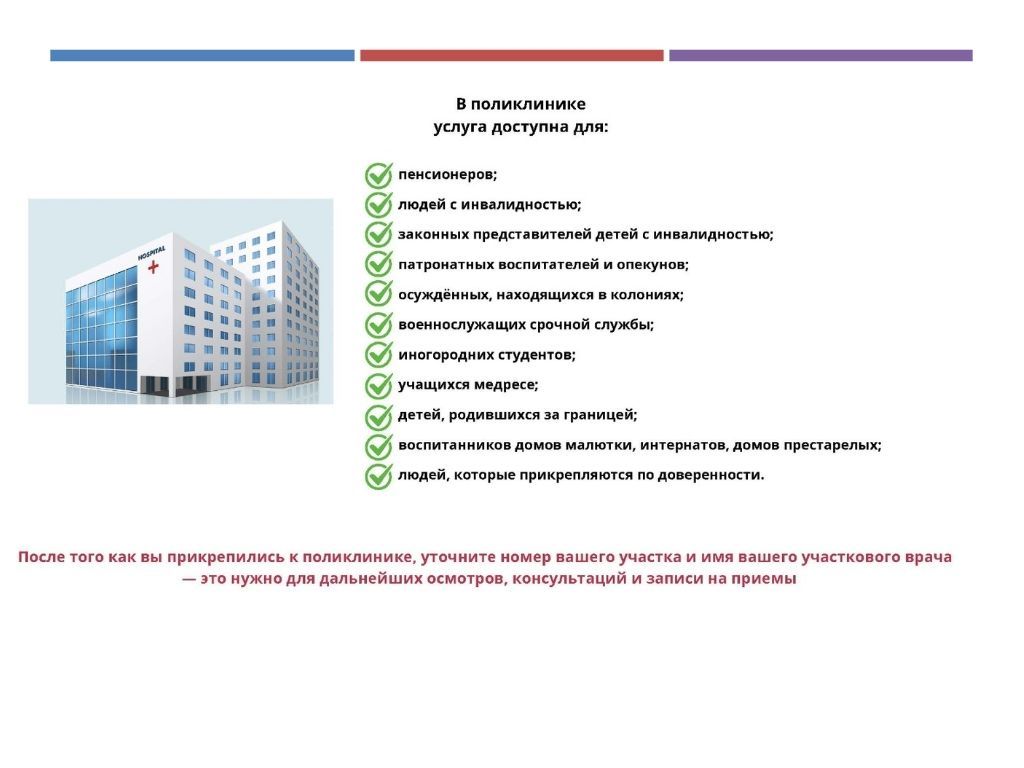 Чтобы получать медицинскую помощь, сначала нужно прикрепиться к поликлинике. Сделать это можно двумя способами: