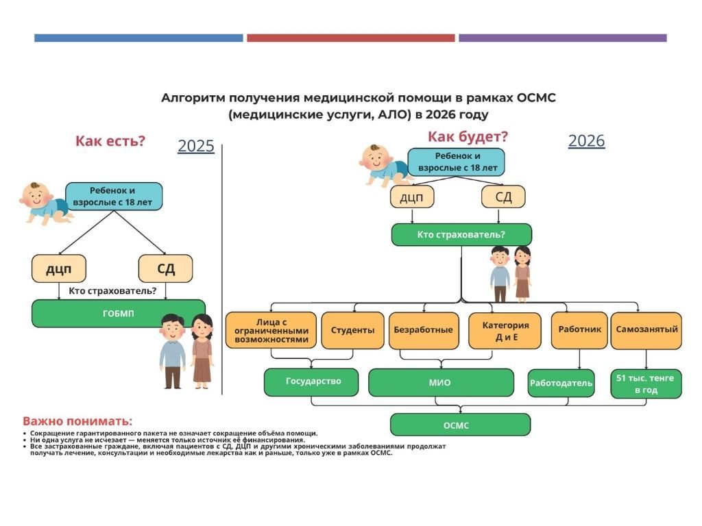 Важно понимать: сокращение гарантированного пакета не означает сокращение объёма помощи. Ни одна услуга не исчезает — меняется только источник её финансирования. Все застрахованные граждане, включая пациентов с сахарным диабетом, детским церебральным параличом и другими хроническими заболеваниями продолжат получать лечение, консультации и необходимые лекарства как и раньше, только уже в рамках ОСМС.