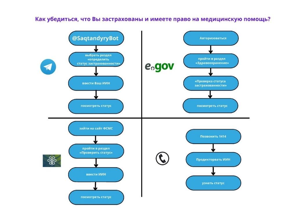 Найти бота: @SaqtandyryBot (бот ФCМС), выбрать раздел «определить статус застрахованности», ввести Ваш ИИН и посмотреть статус: застрахован/не застрахован.
