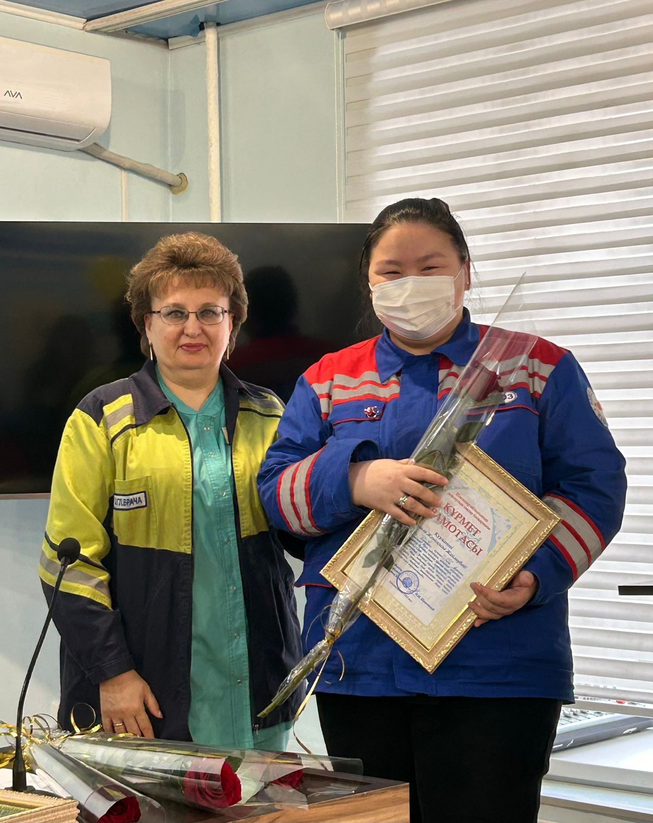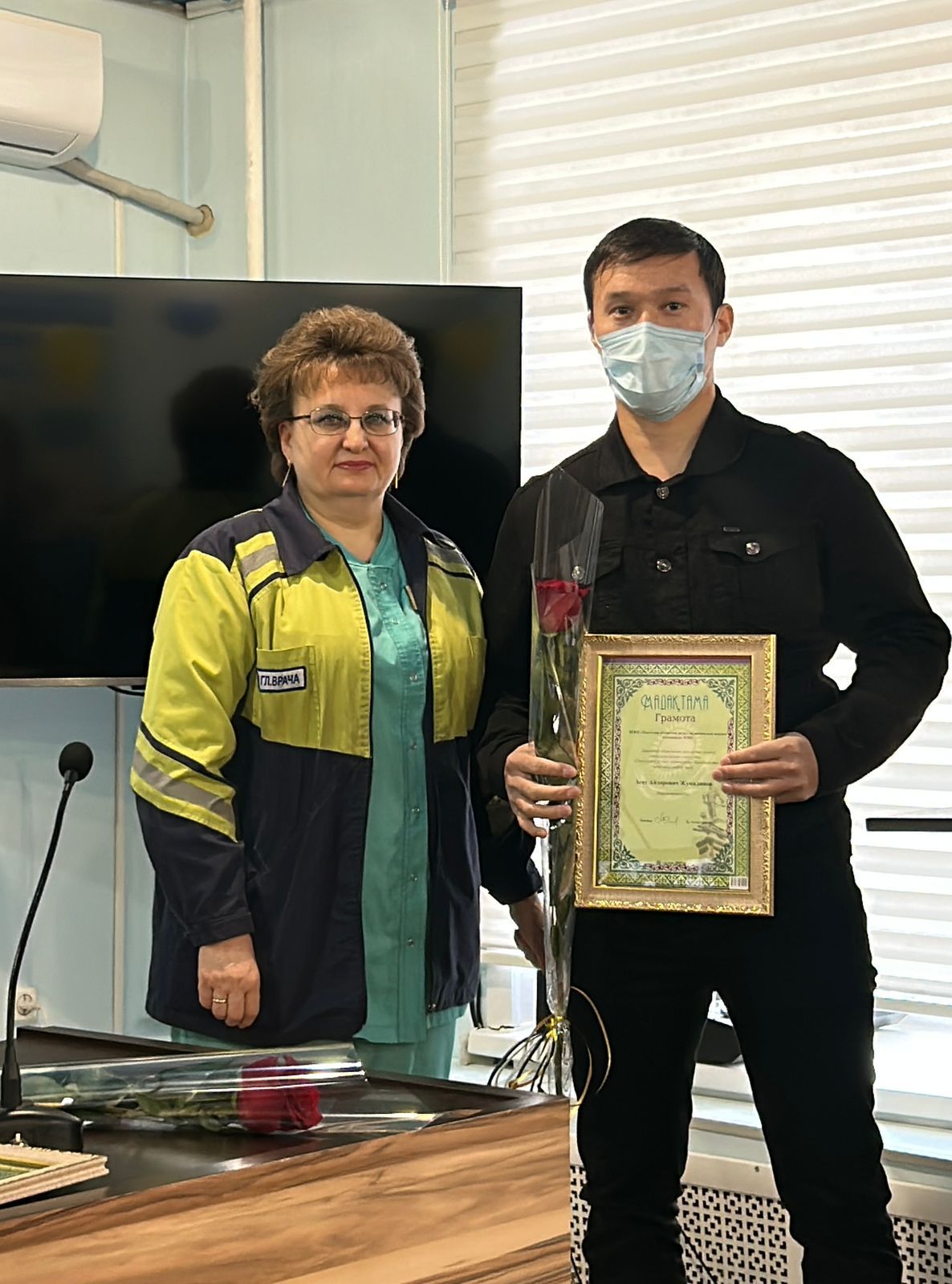 А также, от руководителя СМП за подписью Ахметжанова К.К.были награждены грамотами сотрудники СМП: Кусайнов Сырым Сергазыұлы - врач централной станции СМП, Жумалинов Асет Айдарович - фельдшер ПШБ Штат спец. бригады УЗО, Капуза Эльвира Витальевна - машинист по стирке белья.