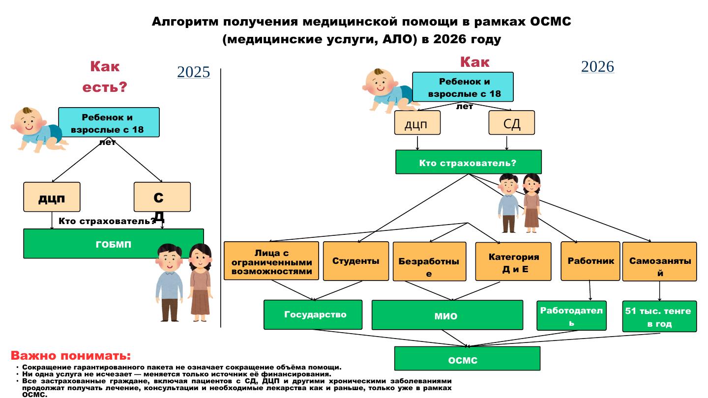— Наша модель медстрахования носит социальный характер, поскольку в основе самой системы заложены принципы социальной справедливости. Каждый платит по возможности, получает по потребности. Состоятельные наши сограждане и люди со средними доходами могут позволить себе лечение в частных клиниках, что не по карману казахстанцам с низкими доходами. Система социального медицинского страхования как раз предназначена для создания равного доступа к медицине для всех, как бы они не зарабатывали и какую бы должность не занимали. Причем объемы получаемых медуслуг не будут зависеть от размера перечисленных взносов. За тех, кто не в состоянии выплачивать взносы в систему медстрахования, плательщиком выступит государство. За каждого казахстанца из социально уязвимых слоев населения, а это сегодня 13 категорий населения и туда входят 10 млн человек, пойдут выплаты из бюджета. Это пенсионеры, дети, многодетные, беременные женщины и находящиеся в декретном отпуске с маленькими детьми, лица с ограниченными возможностями, которые не в состоянии самостоятельно заплатить взносы, они будут находиться под защитой государства. При внедрении системы обязательного социального медицинского страхования данная категория лиц, в том числе инвалиды, будут обеспечены как гарантированным объемом бесплатной медицинской помощи (ГОБМП), так и пакетом медицинских услуг системы ОСМС, то есть им гарантирована помощь государства и медицинские услуги сверх ГОБМП.