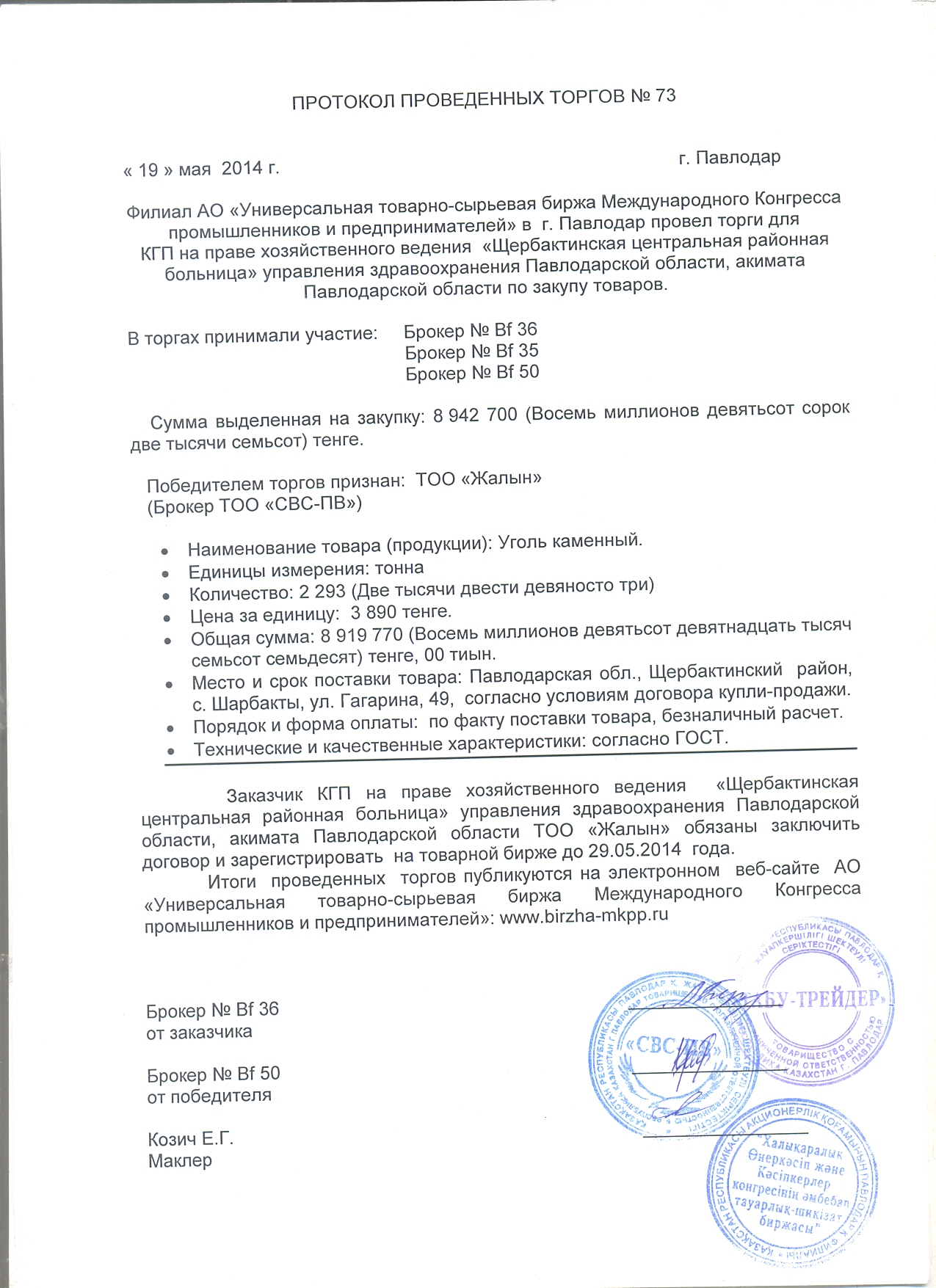 Протокол проведенных торгов №73 КГП на ПХВ "Щербактинская ЦРБ"Протокол проведенных торгов №73 КГП на ПХВ "Щербактинская ЦРБ". Наименование товара: уголь каменый. |