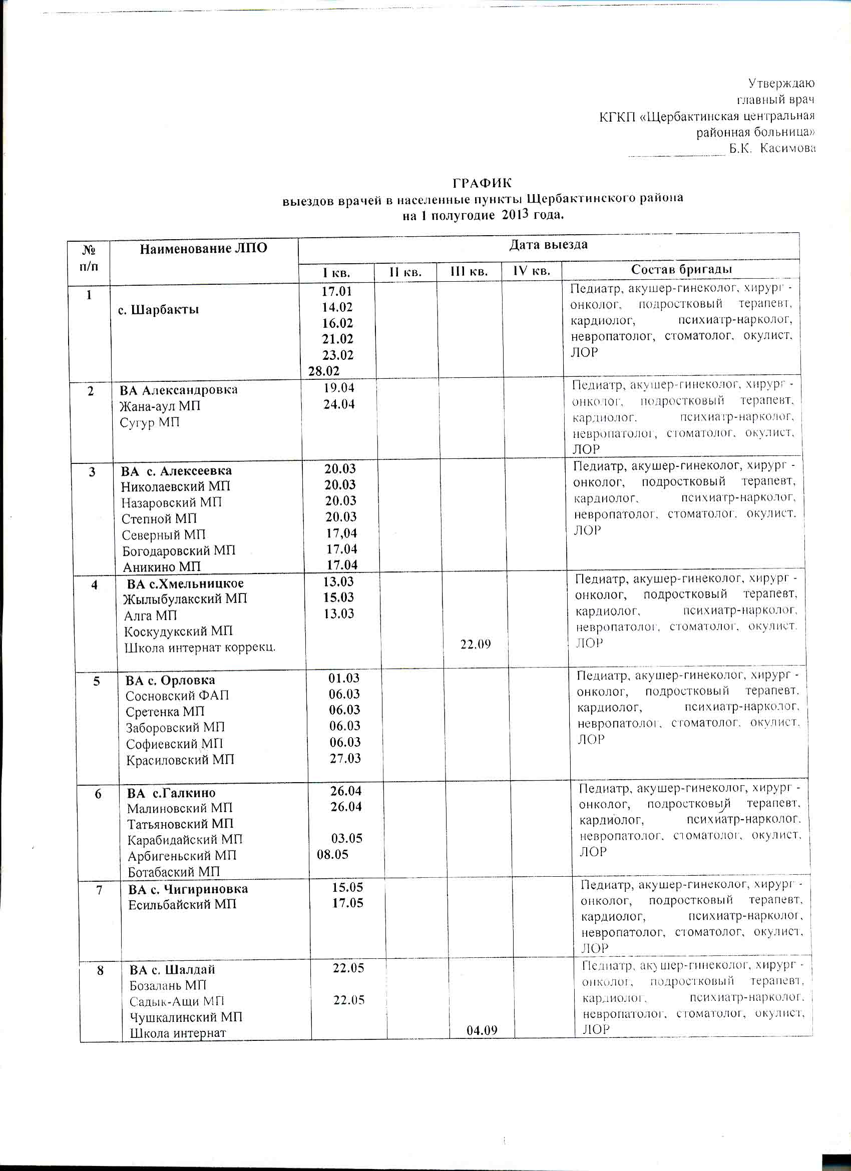 График выездов врачей в населенные пункты Щербактинского районаГрафик выездов врачей в населенные пункты Щербактинского района на 1 полугодие 2013 |