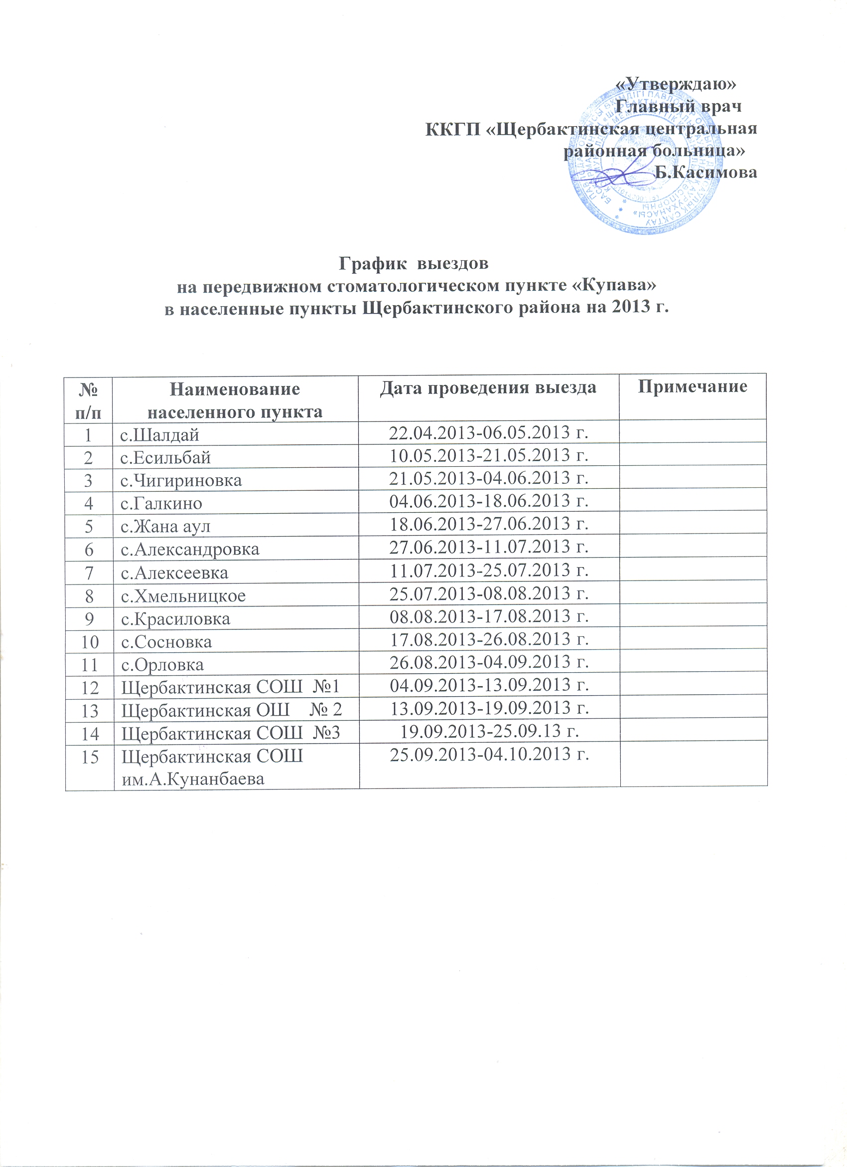 График выездов на передвижном стоматологическом пункте "Купава"График выездов на передвижном стоматологическом пункте "Купава" в населенные пункты Щербактинского района на 2013 г. |